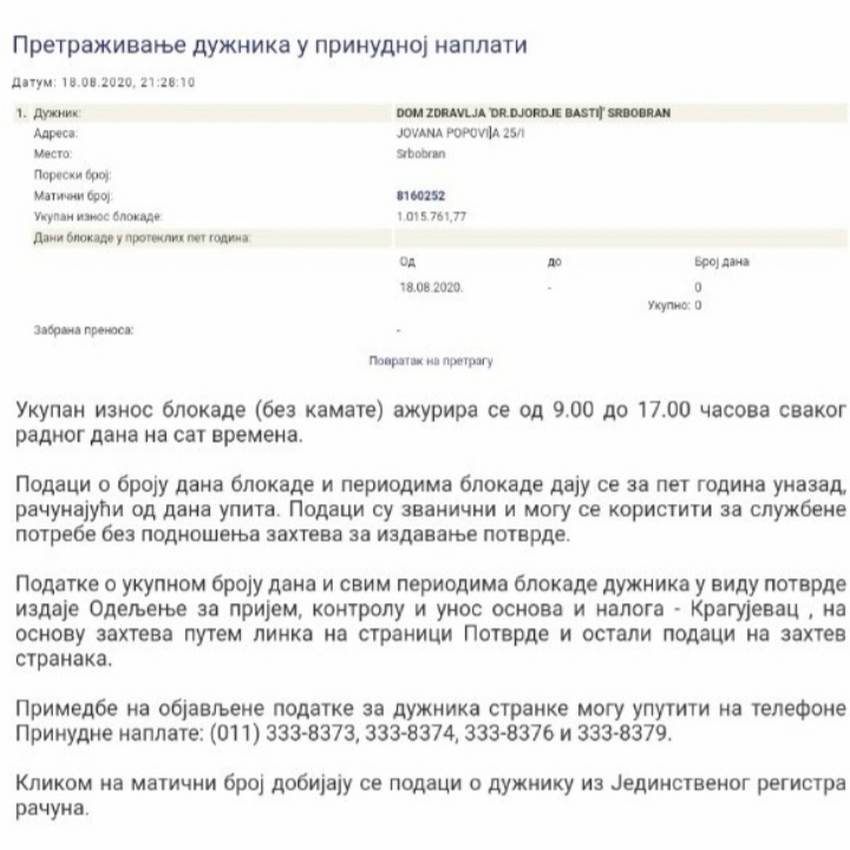 Blokiran račun Doma zdravlja Srbobran ! Partijski menadžment (SNS) ove ustanove na čelu sa direktorom dr Kladar Vlastimirom je "uspeo" da (po našim saznanjima) po prvi put u istoriji ove ustanove dospe do blokade računa. Ne tako davno isti ovaj "tim za razvoj" u sastavu predsednik opštine Radivoj Paroški, član veća za zdravstvo Ilija Gazepov, predsednica UO ove ustanove Nataša Nikolić, i sa dr Vlastimirom hvalio se rezultatima svoga rada. Između ostalog jedan od rezultata je bio i "sertifikat o akreditaciji"...