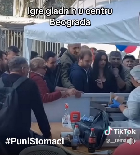 Osim zadovoljstva predsednika i njegove porodice, na ovoj fotografiji primetili smo i da predsednik Opštine, Radivoj Debeljački, na sebi ima narandžasti prsluk. To nas je navelo da se zapitamo: koju ulogu, ili dužnost, je predsednik Opštine Srbobran obavljao na skupu „Ne damo Srbiju“ ? Ovakve prsluke na javnim skupovima najčešće nose redari ili higijeničari, pa se postavlja logično pitanje da li je predsednik naše opštine možda bio redar ili higijeničar na skupu, budući da je prsluk narandžast i bojom podseća na uniformu radnika gradske čistoće. Pošto je dužnost redara da čuva red i mir na skupu, a dužnost higijeničara da skuplja smeće i po potrebi prazni pokretne toalete i održava ih čistim, smatraćemo za veliki propust organizatora skupa ako su (ponavljamo, ako su!) jednom predsedniku opštine i budućem doktoru nauka (!) dali da obavlja takve dužnosti! Ne zato što sumnjamo da on te dužnosti ne bi obavljao vrlo savesno i odgovorno, niti što mislimo da bi mu palo teško to da radi (naprotiv, sudeći po fotografijama suprotnog smo mišljenja), nego što jednostavno nije red da predsednik jedne opštine sa slavnom istorijom, kakva je Srbobran, skuplja otpatke i održava čistoću mobilnih klozeta, ili se brine o bezbednosti ćacija! Još jedan primer nepoštovanja koje je organizator skupa pokazao prema Srbobranu vidi se iz fotografije na kojoj se, pretpostavljamo, nalazi zamenik predsednika Opštine Srbobran, Vladimir Šarčev, snimljen kako se gura sa ostalim učesnicima skupa da bi siroma došao do pljeskavice! Umesto da je za Srbobrance obezbeđen VIP šator, kakav i dolikuje onima koji su toliko učinili za stranku, oni im dali fluorescentne prsluke i pustili ih da se laktaju i guraju sa običnim narodom kako ne bi ostali gladni. Sramota za organizatore skupa, zaista! U Srbobranu se barem zna red – opštinski funkcioneri jedu prvi, za narod ako šta ostane. Tako je nedavno, kada je Pasuljijadom na Gedanki obeležen Dan Roma – jedan Radivoj kuvao, a drugi Radivoj, uz direktorku Doma kulture, prvi je jeo pasulj.