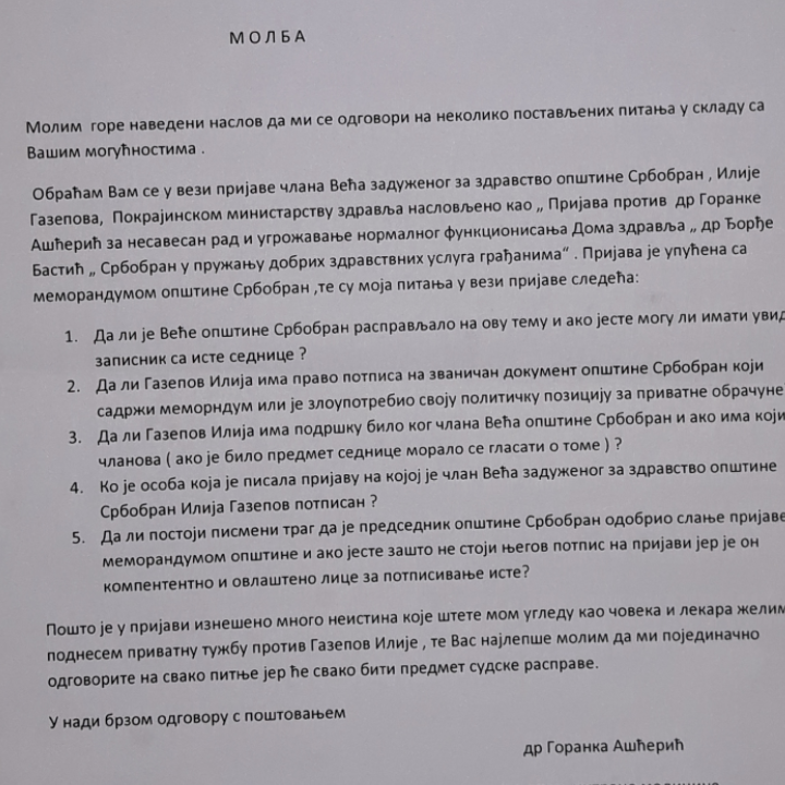 Iz ove molbe kao i iz odgovora predsednika Radivoja Paroskog na molbu, vidimo da je dr.Gazepov bez znanja predsednika opstine,zamenika predsednika opstine i ostalih clanova veca zloupotrebio svoj polozaj i iskoristio zvanican formular opstine Srbobran u svrhu svoga licnog obracuna protiv doktorice Goranke Asceric.Nije on ovom prijavom obmanuo samo svoje kolege iz struke,kolege partijske funkcionere,srbobransku javnost...on je obmanuo i inspekciju pokrajnskog sekretarijata za zdravstvo kojima je i poslao prijavu protiv Ascericke sa sve memorandumom opstine Srbobran, za koje on nije imao ovlascenje.Da li zvanican opstinski formular moze da koristi ko kako stigne i kad ko hoce? Koliko je takvih "zvanicnih" falsifikovanih formulara do sada neovlasceno prosledjeno i na kakve adrese? Kakve smo stete zbog toga svega do sada neznajuci platili, mozemo samo pretpostaviti.Ilija Gazepov je ovim slucajem pokazao svu neozbiljnost,bahatost i samovolju ove opstinske vlasti, koja umesto da se bavi resavanjem nasih problema, koristi nezakonito resurse i benefite opstine da bi resila iskljucivo svoje.Na zalost obicnih ljudi ni SNS nije pokrenuo nikakav postupak protiv njihovog clana Ilije Gazepovog.Zbog ovakvog kaljanja ugleda visokomoralnih naprednjaka Gazepov je morao biti iskljucen iz clanstva stranke - to bi ga "sigurno" opametilo ! Srbobranci znaju da su medjuljudski odnosi u ustanovi Dom zdravlja "Dr.Djordje Bastic" odavno poremeceni,prakticno od dolazka dr.Gazepovog (inace zaposlenog u toj kuci) na mesto clana opstinskog veca za oblast zdravstva.Njegova sujeta,netrpeljivost,dvolicnost i osvetoljubivost prema svakom kolegi koji ima drugaciju poslovnu viziju od njega,ili je cenjeniji u krugu svojih kolega u meri u kojoj se on oseti manje vrednim,Gazepovom predstavlja nekog koga treba omalovaziti ili ga diskreditovati na svaki moguc nacin.Najgore prodje onaj ko mu direktno stane na put u ostvarivanju nekog (za Gazepova) vaznog interesa.Cime je Gazepov  zasluzio da se o njemu ovoliko pise i u kojoj meri je on konfliktna licnost, vidi se u tome da njegova "meta" nije samo dr.Asceric ! Naime,veliku neprijatnost od njega i od pojedinih (SNS) opstinskih funkcionera je dozivela i dr. Rajak Svetlana,kao v.d.direktor Doma zdravlja "DR.Djordje Bastic".Kakav je to problem gospodja Rajak imala pogledajmo u sledecem video zapisu - OTVORI OVAJ LINK...https://youtu.be/2GFjw0Bj8bk