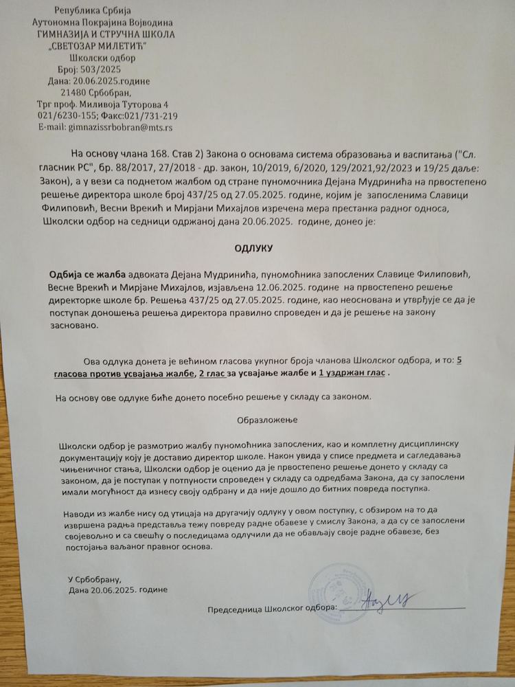 Školski odbor Gimnazije i stručne škole „Svetozar Miletić“ na sednici održanoj u petak glasao je po žalbi koju je punomoćnik profesorica Slavice Filipović, Vesne Vrekić i Mirjane Mihajlov, podneo na rešenje o otkazima koje je profesoricama uručila direktorka Jasmina Crveni.