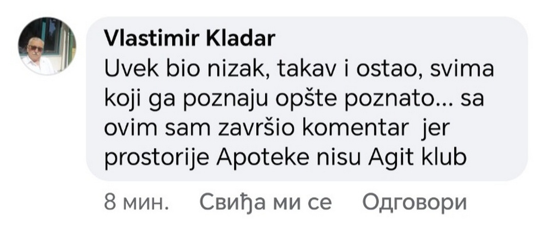 A odgovor direktora (prema komentaru koji je ostavio ispod te objave) nije bio ni institucionalan ni odgovoran, nego ličan, ponižavajući i primitivan: „Uvek bio nizak, takav i ostao, svima koji ga poznaju opšte poznato… sa ovim sam završio komentar jer prostorije Apoteke nisu Agit klub.“