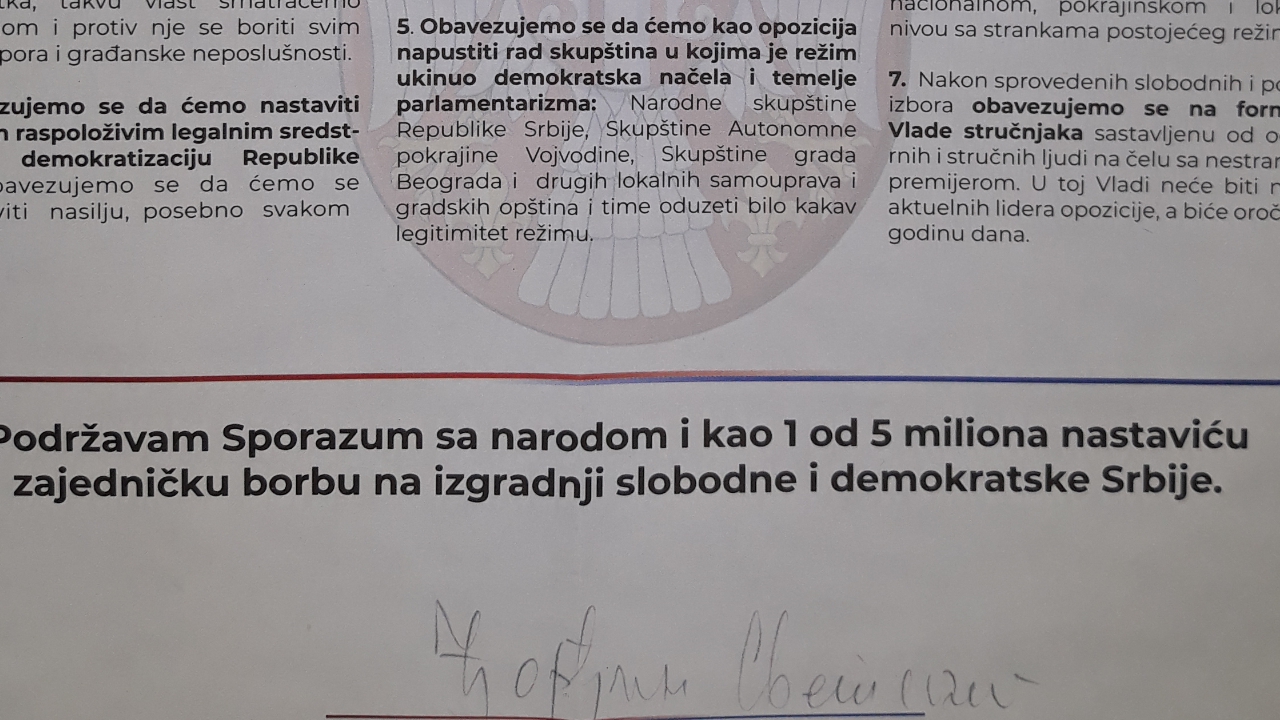 - Lustracija je kao takva jedna od tačaka "Sporazuma sa narodom", i na osnovu dogovora čelnika "Saveza za Srbiju" postoji iskrena namera da se lustracija i uradi. Ono što nije urađeno 6. oktobra 2000. godine, sada postoji politička volja za takvim nečim. Greške opozicije koje su po ovom pitanju načinjene u prošlosti sada će biti sigurno ispravljene, i ta rešenost u potpunosti postoji. Lustracija i kontrola porekla imovine će se raditi ne od 2007. godine kako ova vlast predlaže, nego od 1990. godine pa do danas. Proveriće se ko je kako stekao imovinu i na koji način je došao do sredstava kojim raspolaže. Zato odlaskom u Beograd 13. aprila pokazaćemo svima u svetu da ovo stanje u Srbiji više ne može da se trpi, tražićemo ostavku Aleksandra Vučića i njegovog režima.