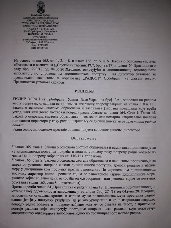 ... da se Grujić uplašio, povukao i učlanio u SNS. Međutim NIJE ! Na poziv gospodina Zorana Grujića imali smo priliku da prisustvujemo raspravi, u svojstvu građanina, na disciplinskom postupku koji se vodio protiv njega. Ovaj disciplinski postupak je samo nastavak priče o kojoj je "Bezcenzure.info" nedavno pisao u tekstovima pod naslovom "Nezakonite radnje u predškolskoj ustanovi" i " Pismo Paroškom - mi nismo vaši". Disciplinski postupak protiv Grujića je zakazala v.d. direktora P.U. "Radost" Srbobran, gospođa Biljana Bajić, a prisutni su još bili pravni zastupnik ove ustanove advokatica Jelena Tijanić, svedoci Todor Šimpraga i vaspitačica Ruža Hromiš, Zoran Grujić kao okrivljeni i njegov pravni zastupnik advokat Danijel Dinčić. Zapisnik sa rasprave je vođen od strane stručnog lica, angažovanog od strane predškolske ustanove. Ova tema ne bi u javnosti podstakla toliko interesovanje da slučaj po našem mišljenju nije isprepleten političkim motivima, nepotizmom, stranačkim zapošljavanjem i antagonizmom unutar kolektiva, u kom bi bar trebalo da se zna da su DECA NA PRVOM MESTU. Postupak je vođen u prostorijama dečijeg vrtića "Radost", 06. jula, sa početkom u 09.30. časova.