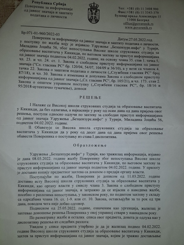 O dešavanju u ovoj ustanovi pisano je više puta do sada ali nakon sedam meseci istraživačkog rada, pisanja zahteva i urgencija Visokoj školi strukovnih studija za obrazovanje vaspitača u Kikindi, da nam dostavi diplomski rad gospođe Bajić, do traženog dokumenta "Bezcenzure.info" je došao preko Poverenika za informacije od javnog značaja i zaštitu podataka o ličnosti.