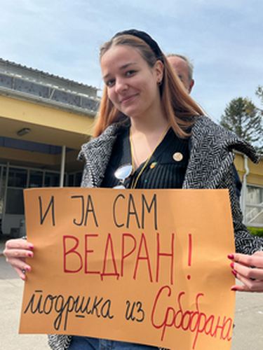 Teodora Momčilović, studentkinja iz Srbobrana, sa transparentom podrške za kolegu