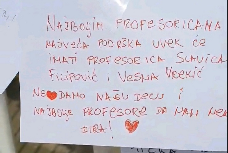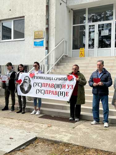 Još jedan protest podrške profesoricama održan je ispred srbobranske Gimnazije i stručne škole „Svetozar Miletić“. Sadašnji i bivši učenici, njihovi roditelji, građani Srbobrana, kolege prosvetari i prijatelji iz drugih naseljenih mesta, okupili su se ispred srbobranske srednje škole kako bi pružili podršku profesoricama protiv kojih je pokrenut disciplinski postupak. Da podsetimo čitaoce, direktorica Gimnazije pokrenula je nedavno disciplinski postupak protiv profesorica koje su obustavile nastavu u znak solidarnosti sa studentskim zahtevima, ali i zbog osećanja ugrožene bezbednosti.