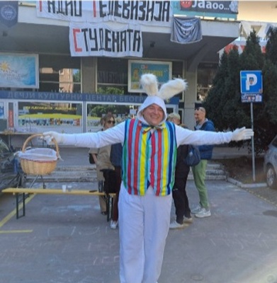 Kao što smo i obećali našim čitaocima, bezcenzure.info dočekao je Vaskrs sa studentima koji blokiraju RTS. Nakon svečane Vaskršnje liturgije u Sabornoj crkvi u Beogradu, dočekali smo i vaskršnje jutro sa našom omladinom, i verujte, osećaj je predivan. Uz tradicionalni pozdrav Hristos vaskrse, studenti nastavljaju da šalju poruke ljubavi, mira, tolerancije i zajedništva, boreći se svakog dana za istinu.  U ranim jutarnjim časovima ispred RTS-a bio je nešto manji broj ljudi nego što je to uobičajeno od početka blokade, što je i razumljivo, budući da su mnogi građani bili na bogosluženju u vreme kada smo pisali ovaj tekst. Upravo zato su tu Novopazarci – došli su da čestitaju svojim kolegama najveći hrišćanski praznik, ali i da ih odmene na blokadi, kako bi pravoslavni i katolici mogli da odu na liturgiju i na miru proslave Vaskrs sa svojim porodicama, bez bojazni da će se prestati sa “pumpanjem”. Na pitanje kada je došla, da li je umorna i da li joj se spava, studentkinja iz Novog Pazara sa kojom smo razgovarali, poručila je sledeće: “Tu sam od petka i nisam umorna. Nisam ja došla ovde da spavam! Došla sam da svojoj braći i sestrama čestitam njihov najveći praznik, i da ih odmenim kako bi mogli u miru Božijem da ga proslave. Naša poruka jeste da je Pazar “svijet”, ali je Pazar na prvom mestu Srbija! Mi volimo svoju zemlju i drugu nemamo. Zato poručujem svim građanima pravoslavne ili katoličke veroispovesti da im od sveg srca čestitam Vaskrs, da ga proslave sa svojim najmilijima i neka ne brinu – i mi smo tu i pumpamo do kraja”! Tu su i zborovi građana. Zbor građana opštine Palilula tu je od srede, a Palilulci se smenjuju na svakih 8 sati kako bi 24 sata dnevno bili uz studente, ističe Vanja iz zbora građana Palilula: “Mi smo ovde prvenstveno da pomognemo studentima – skuvamo kafu, čaj, ili spremimo hranu. Tri dana zaredom smo i kuvali, mrsno i posno, za one koji drže Vaskršnji post. Studenti su predivni, atmosfera je odlična, a ljudi svakodnevno donose donacije. Mi ćemo biti uz studente do kraja. Dakle, ili dok RTS ne bude ugašen ili dok se ne raspišu izbori za novi REM. Da li pumpamo do kraja? Apsolutno, nema odustajanja”! Uz studente je i zbor građana sa Bežanijske kose, a kako Nenad sa kojim smo razgovarali kaže, studenti rade odličnu stvar jer rade na promeni svesti: “Mi smo uvek uz studente, pa smo tako podržali i ideju formiranja zborova na koju su studenti pozvali. Funkcionisanje institucija neće doći preko noći. Upravo zato je potrebna promena svesti građana, i mislim da studenti uspešno rade na tome. Učestvovanje pojedinca u politici ne svodi se samo na izbore, zato mislim da su zborovi neophodni, jer na taj način svi možemo uticati na donošenje odluka, što mislim da je neophodno za jedno zdravo društvo. Biće potrebno mnogo vremena da se to u potpunosti ostvari, ali idemo ka tome, pratimo našu decu i uspećemo. Poruka za Vaskrs: svima želim ljubav, sreću i zdravlje. Hristos vaskrse”! Studente je ovog jutra posetio i Vaskršnji zeka, koji je takođe imao poruku za sve: “Hristos vaskrse! Želim svima srećan praznik! Ja sam ovde obučen u kostim zeca da malo podignem vaskršnji duh i atmosferu ove naše dece. Vrlo je jednostavno danas u Srbiji birati – ovde su mladi i pametni, tamo (u Ćacilendu) su stari i neinteligentni. Izbor je lak. Živeli studenti, živela mladost, živela Srbija”!  Posle ovakvih poruka, nama ostaje samo da se složimo sa izrečenim i da poručimo još jednom da ćemo i mi pumpati do kraja. Hristos vaskrse!