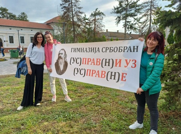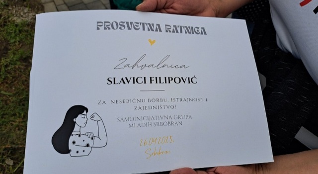 Nakon toga, prisutnima se obratila Slavica Filipović, profesorka srpskog jezika i književnosti u srbobranskoj Gimnaziji, koja je jedna od tri profesorice u toj školi koje su obustavile nastavu u znak solidarnosti sa studentima (jedine u celoj opštini Srbobran).
