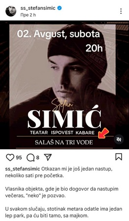 Književniku, pesniku, tekstopiscu i glumcu Stefanu Simiću juče je otkazan nastup, nekoliko sati pre početka. Naime juče u 20 časova u prostoru salaša "Na tri vode" u Turiji, ovaj umetnik je trebao predstaviti svoj kabare građanima naše opštine. Ponavljam "trebao je" ali ga je vlasnik objekta lokala Na tri vode pozvao telefonom i otkazao mu korišćenje ovog prostora iz razloga, kako navodi umetnik, "neko je pozvao vlasnika lokala".