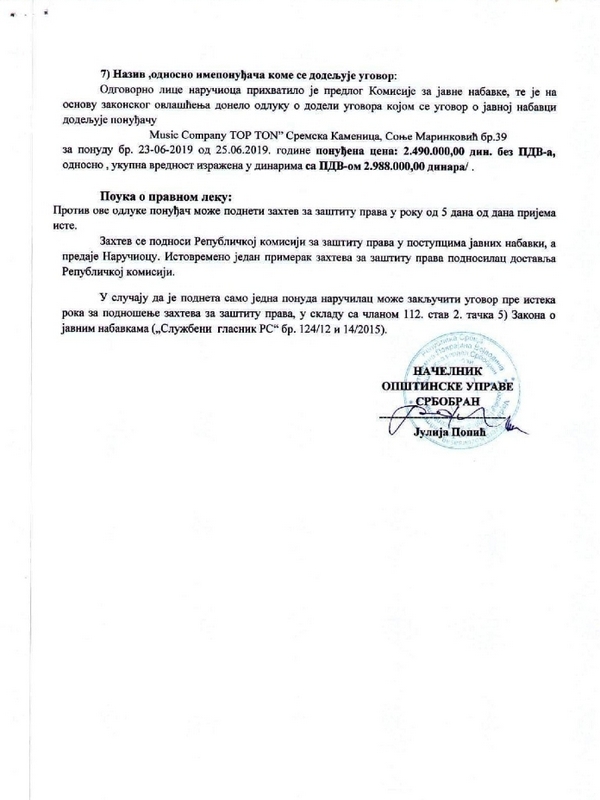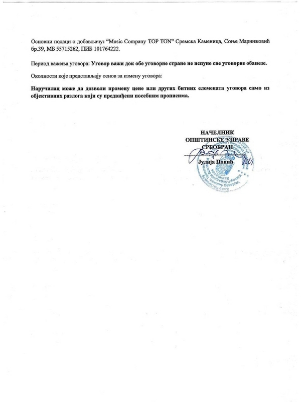 ČETVRTI DOKUMENT: Obaveštenje o zaključenom ugovoru je takođe formalnost kojom se zaključuje pseudozakonski postupak za jednog ponuđača.