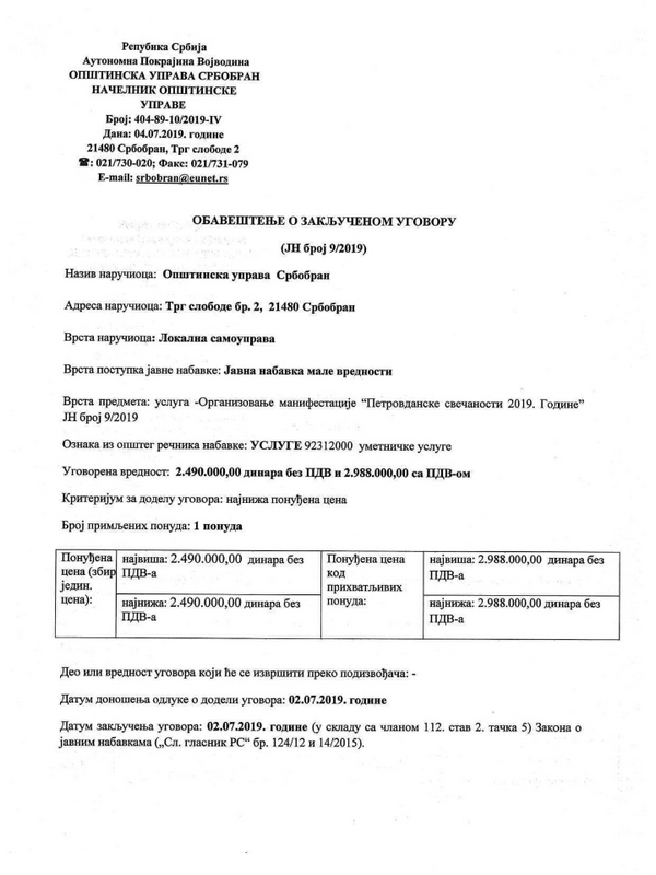Komisija za javne nabavke opštine Srbobran je za ovogodišnje "Petrovdanske svečanosti", na ime troškova za gostujuće muzičare, binu, toalete i ogradu, ugovor dodelila firmi " TOP TON " iz Sremske Kamenice, koja je bila jedini ponuđač. Kao odgovarajuću i najniže ponuđenu, opštinska komisija je prihvatila cenu koja iznosi skoro 3 miliona dinara, ili po srednjem kursu preračunato nešto više od 25 hiljada evra. Važno je napomenuti da se navedena suma odnosi samo na umetničke usluge, ili muzički program u sklopu organizovanja manifestacije "Petrovdanske svečanosti 2019. godine", koja uključuje još i izdatke za hranu, piće, cveće, obezbeđenje, zabavu za odabrano društvo u dvorištu Opštine, dnevnice i honorare, odnosno brojne i raznovrsne troškove zarada svih koji su u bliskim odnosima sa lokalnom vlašću. Stoga, ukupna cena ovogodišnjih "Petrovdanskih svečanosti" je mnogo veća od tri miliona dinara i veoma ju je teško precizno odrediti zbog mnoštva stavki i pravničkih koruptivnih manipulacija s javnim nabavkama malih i velikih vrednosti.